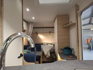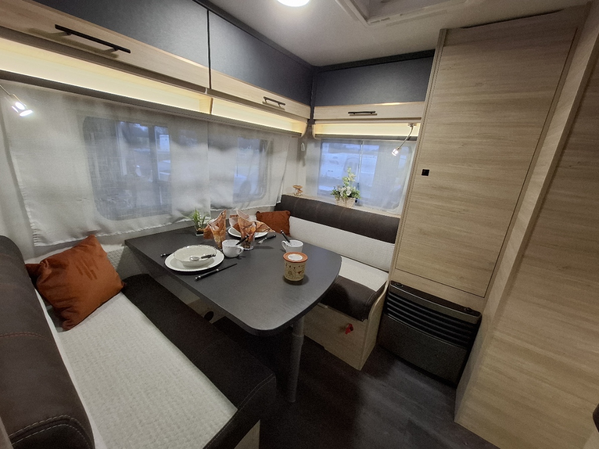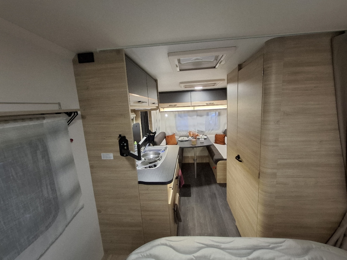 Caravane d'occasion très récente - Une Touring avec un couchage sous toit relevable confortable (comme sur un fourgon) - Cet équipement fait de cette caravane une vraie familiale avec en complément son grand réfrigérateur à compression de 133L. Elle est déjà équipée de son déplace caravane et du store Thule avec éclairage LED intégré.