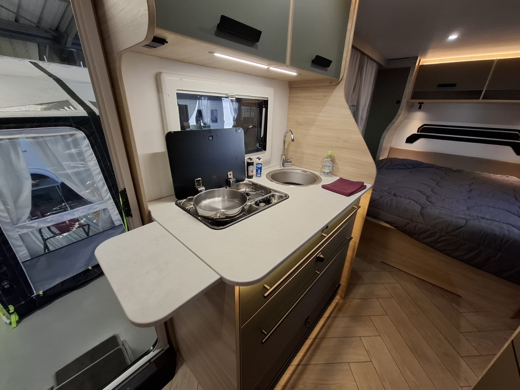 Malgré ses 2,10 m de large, elle dispose d'un lit central. Elle dispose d'un excellent niveau d'équipements et sera mise à disposition avec au choix, un auvent classique ou un auvent gonflable ou un store de paroi posé (voir conditions en fin d'annonce)