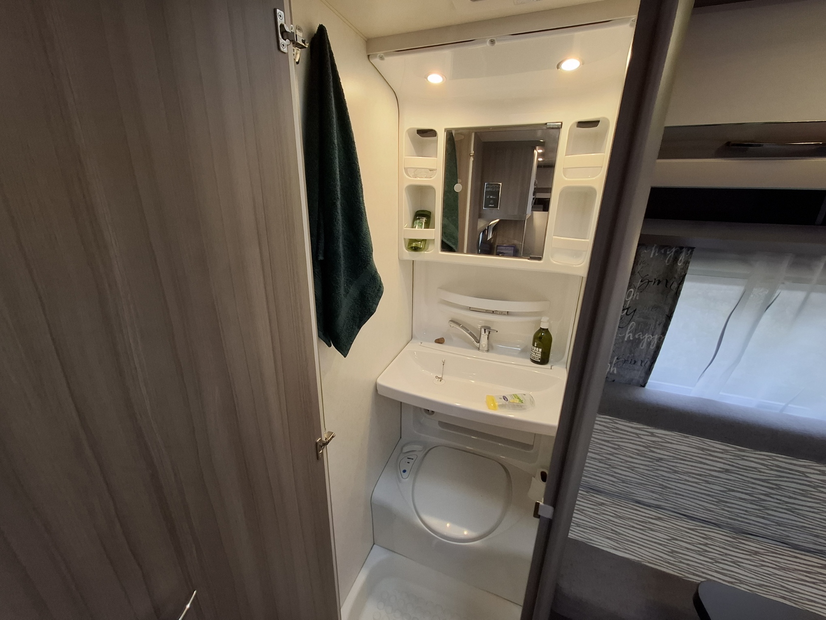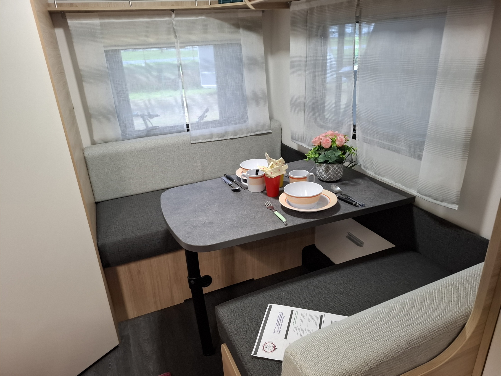Caravane compacte, confortable et idéalement équipée pour passer de bonnes vacances : lit permanent, coin repas spacieux qui pourra être transformé en couchage complémentaire, cabinet de toilette avec WC et lavabo, coin cuisine.
