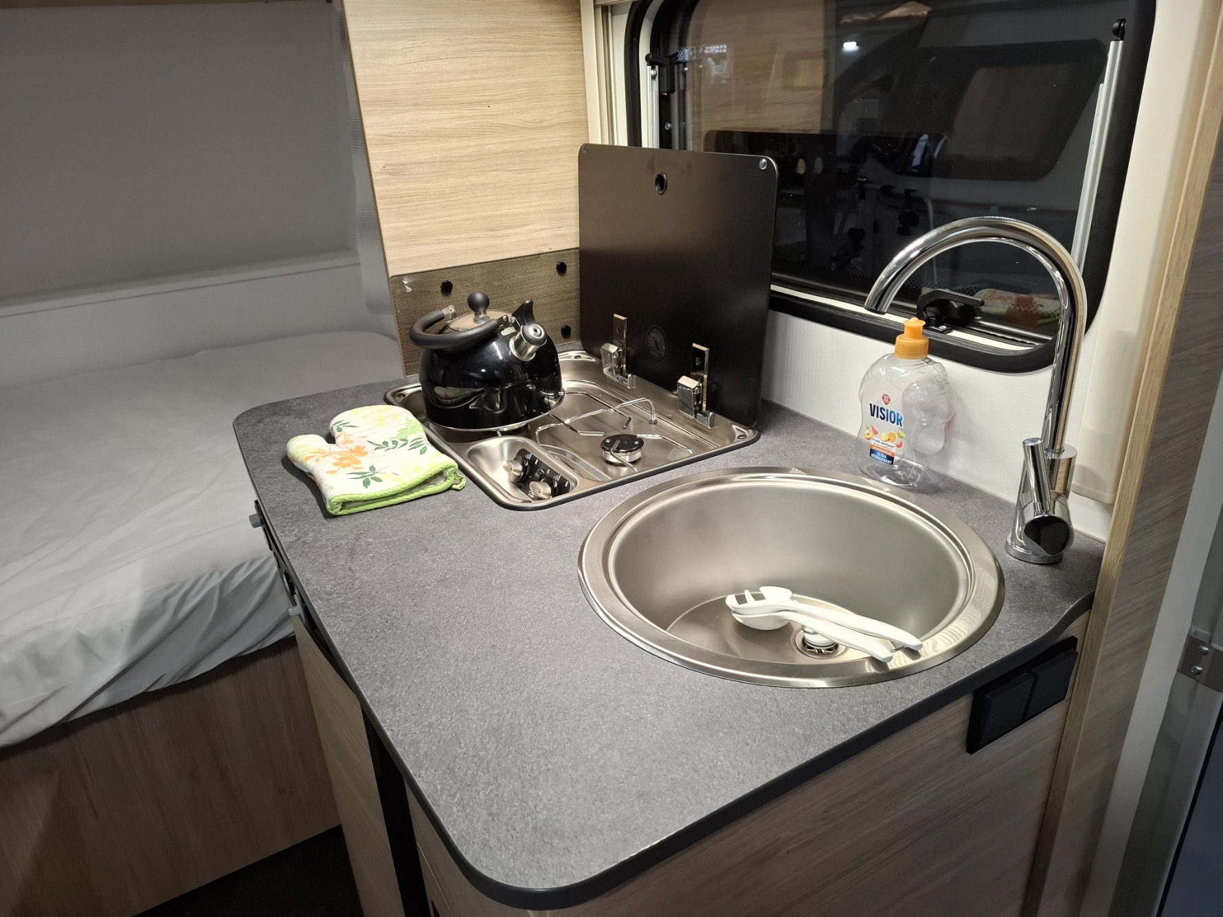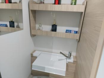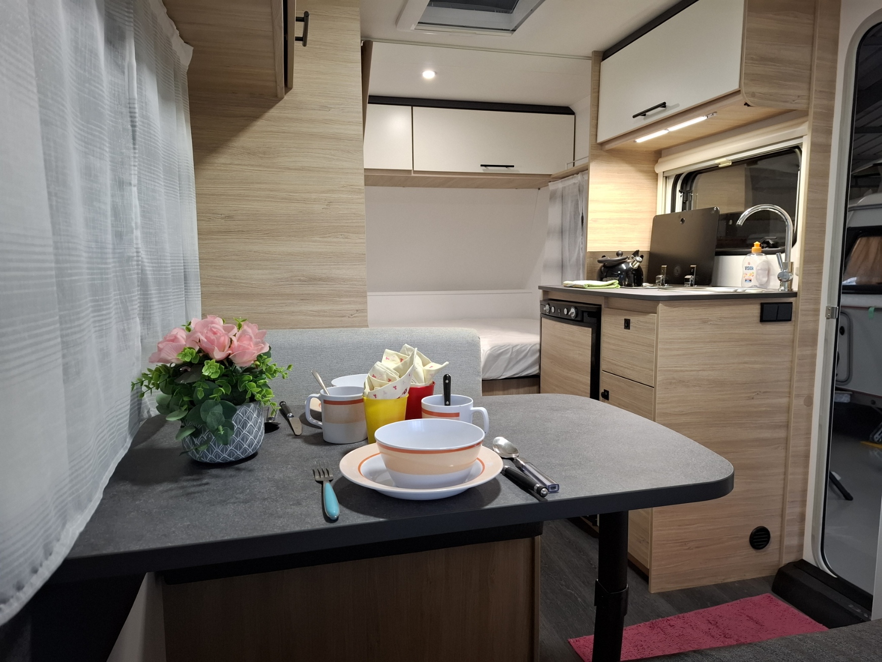 La vidéo que nous avons liée à notre annonce a été réalisée sur notre modèle d'exposition 2024. Quelques petites différences à noter : couleur des plans de travail de la table de dînette et du bloc cuisine, ce n'est plus un combi "réchaud:évier" mais chaque élément est distinct, l'évier est rond et le réchaud propose 2 feux, au lieu de 3, ce qui est plus rationnel dans l'usage quotidien. Les volumes et l'implantation ne changent pas !